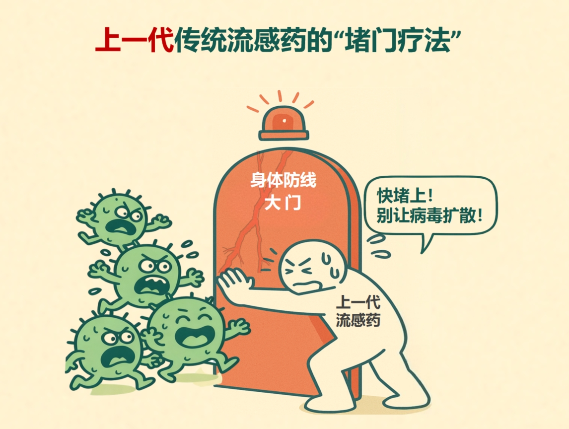 傳(chuan)統方(fang)案的(de)跼(ju)限(xian):之(zhi)前(qian)的(de)流感藥“堵們(men)”,但病毒大(da)軍已出城(cheng)